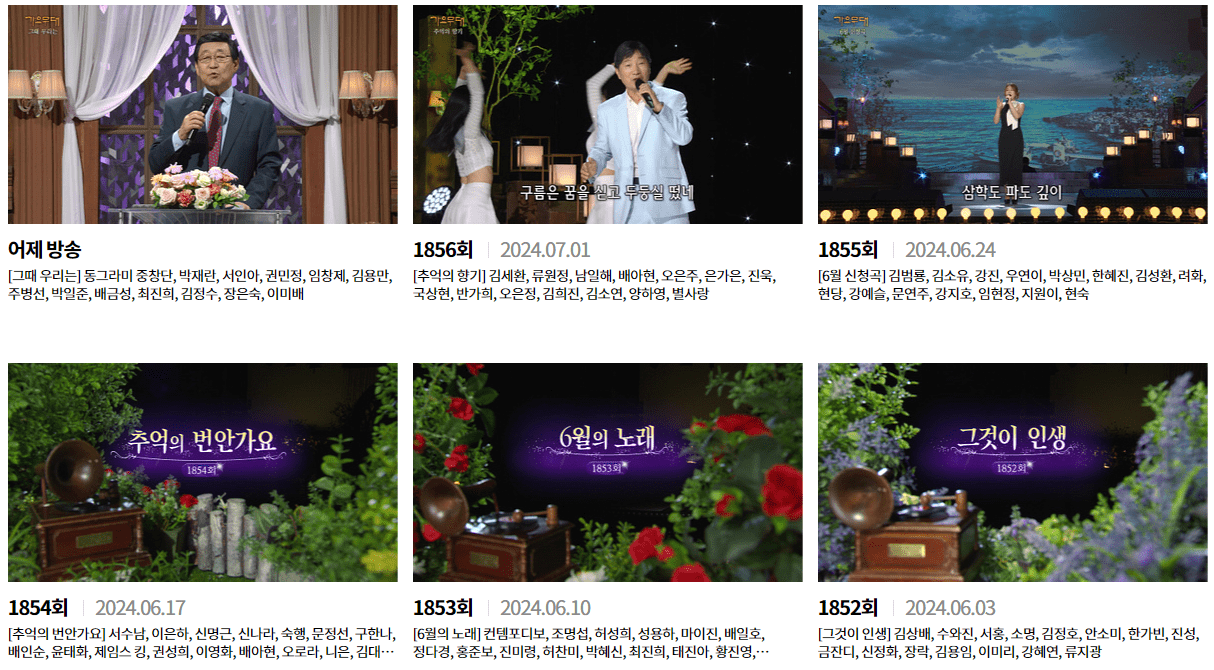1985년 첫 방송을 시작으로 흘러간 트로트와 가요를 통해 향수와 추억을 되새기는 중장년층 대상 음악 프로그램입니다.