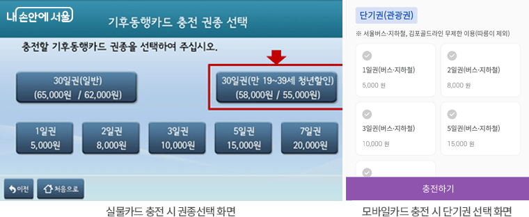 청년들은 7천원 할인된 5만5천원(따릉이 미포함), 5만8천원으로 바로 충전하여 사용할 수 있게 됩니다.