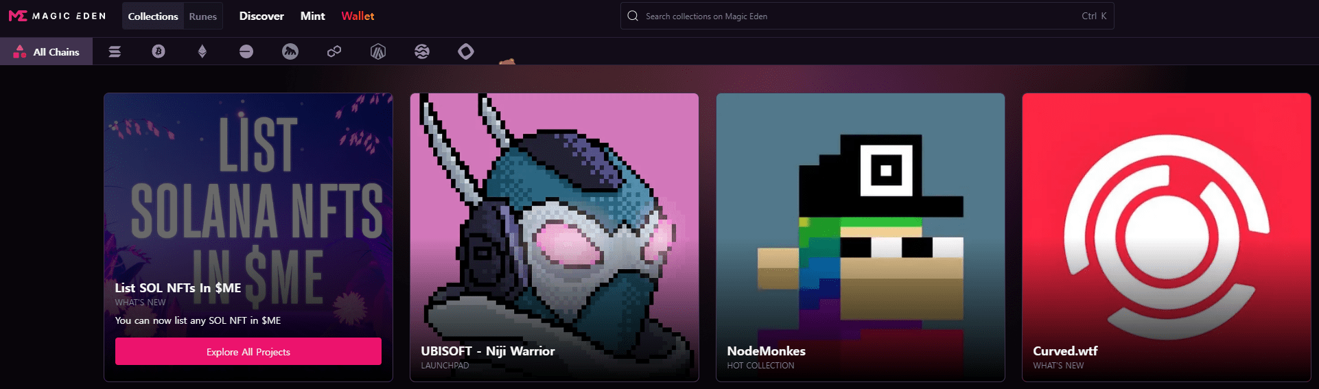 매직에덴 플랫폼은 2021년 9월부터 시작되어 현재 이더리움, 비트코인, 솔라나, 폴리곤, 베이스 등 다양한 블록체인 네트워크 기반 NFT 거래를 지원하고 있습니다.