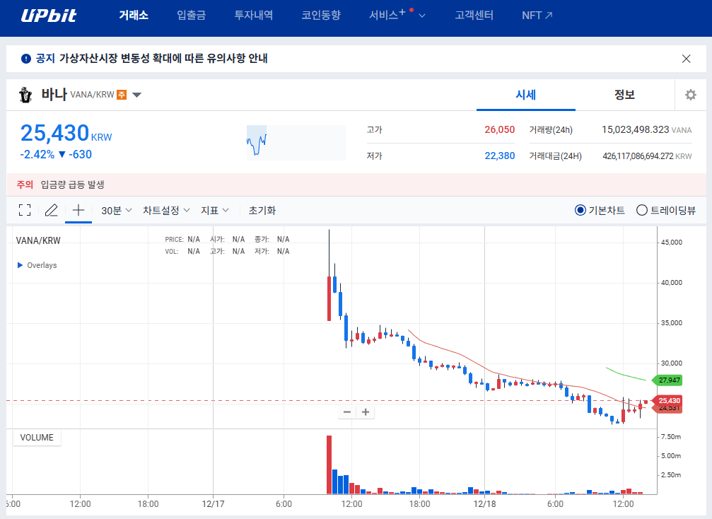 최근 바나코인은 상장 직후 3만5260원을 기록하며 큰 주목을 받았습니다. 현재 시세는 약 2만5,000원으로, 상장 직후보다 하락한 상태입니다.