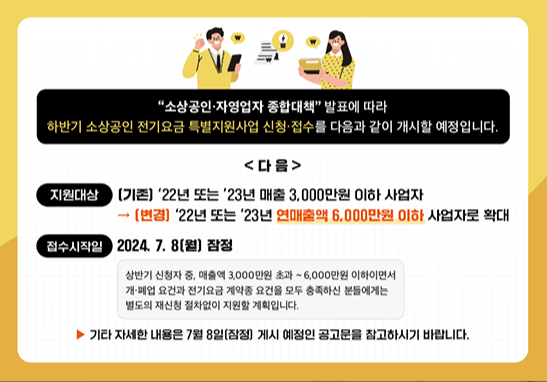 연매출 6,000만 원으로 기준이 2배 늘어나서 전기요금 지원 혜택을 받을 수 있는 소상공인 개인사업자와 법인사업자가 보다 늘어났습니다.