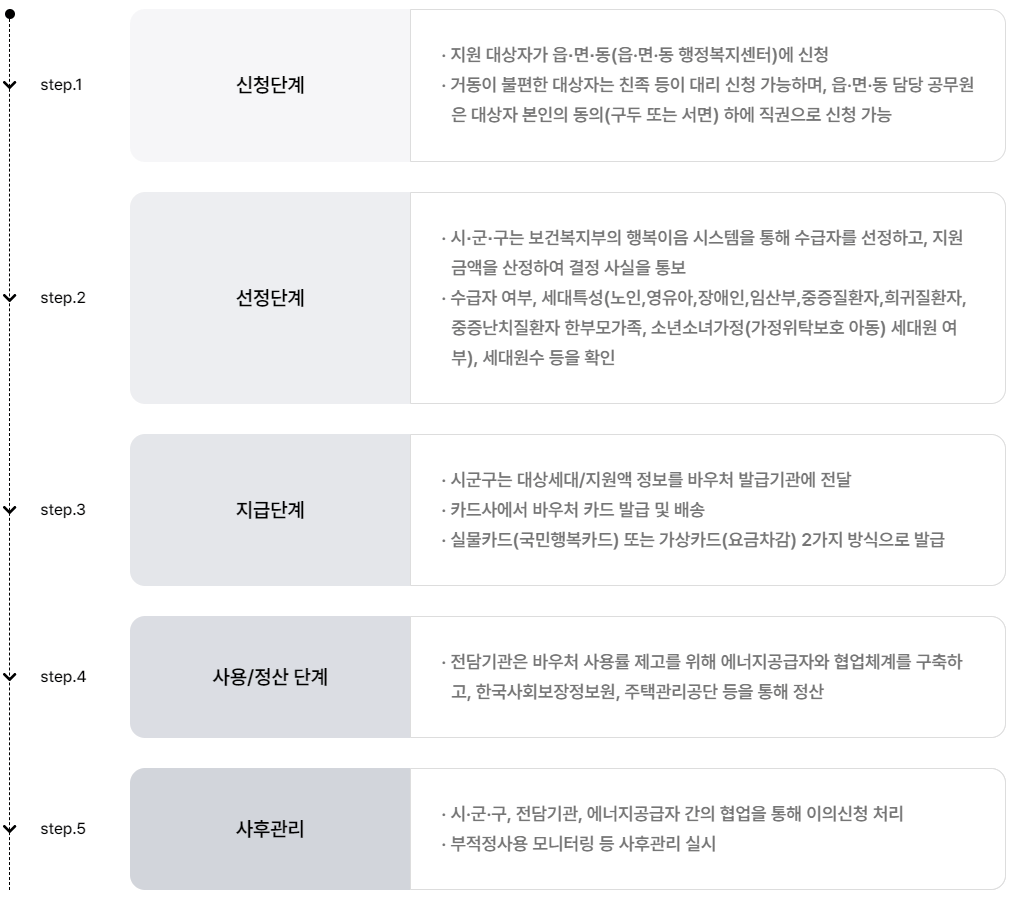 이를 통해 전기, 도시가스, 난방, 등유 LPG, 연탄을 구입하여 에너지를 사용할 수 있는 제도입니다.