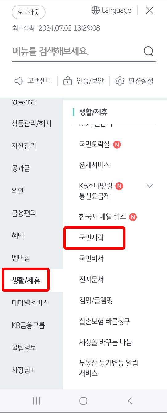 2) 생활/제휴 > 국민지갑을 누릅니다.