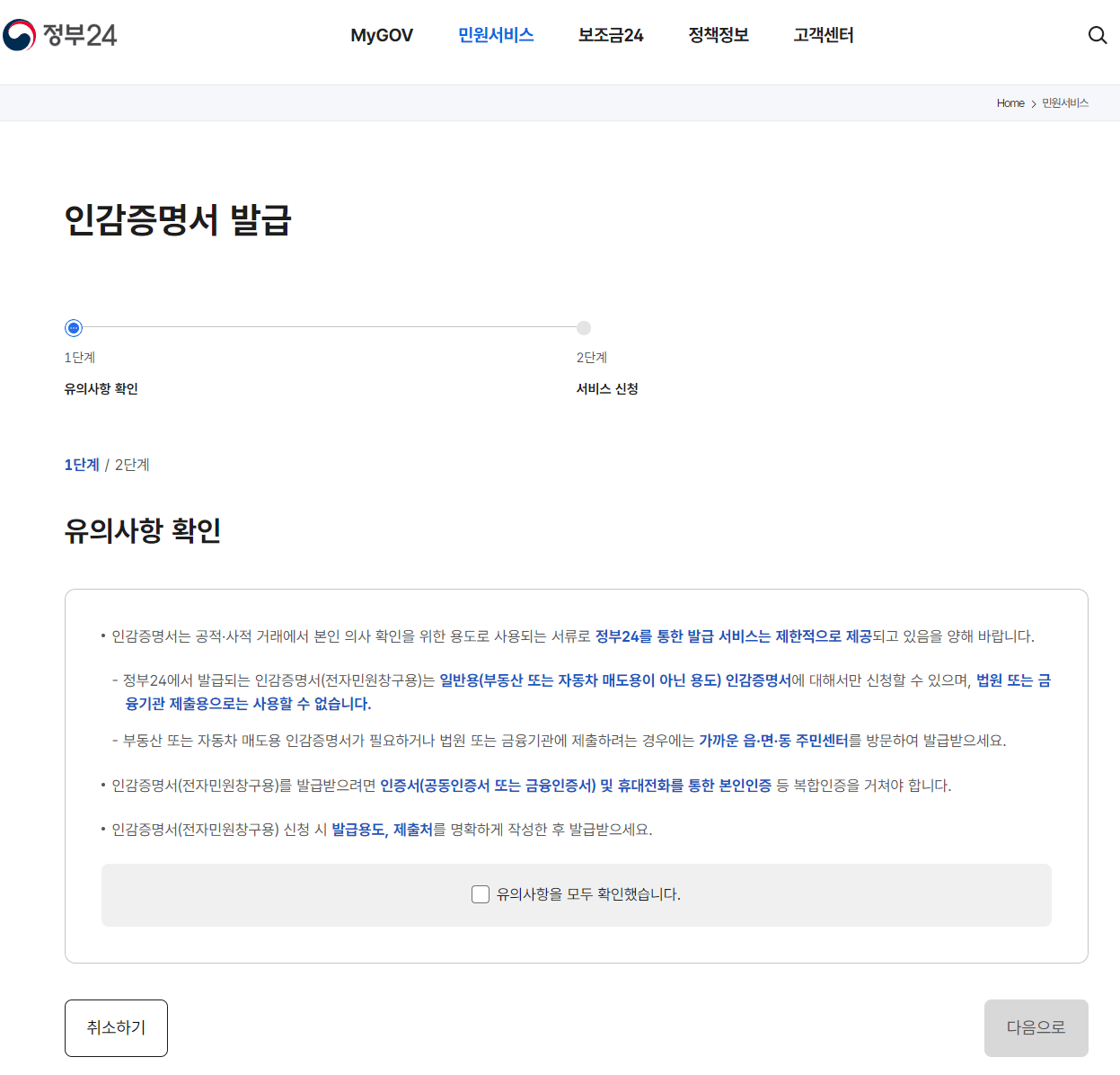 3) 인감증명서 발급에 대한 유의사항 확인에 체크하고 [다음으로] 버튼을 클릭합니다.