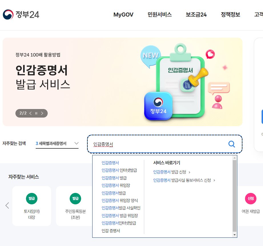 2) <인감증명서>라고 검색하고 엔터를 칩니다.