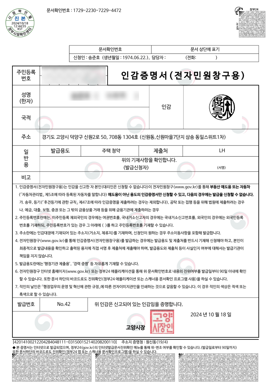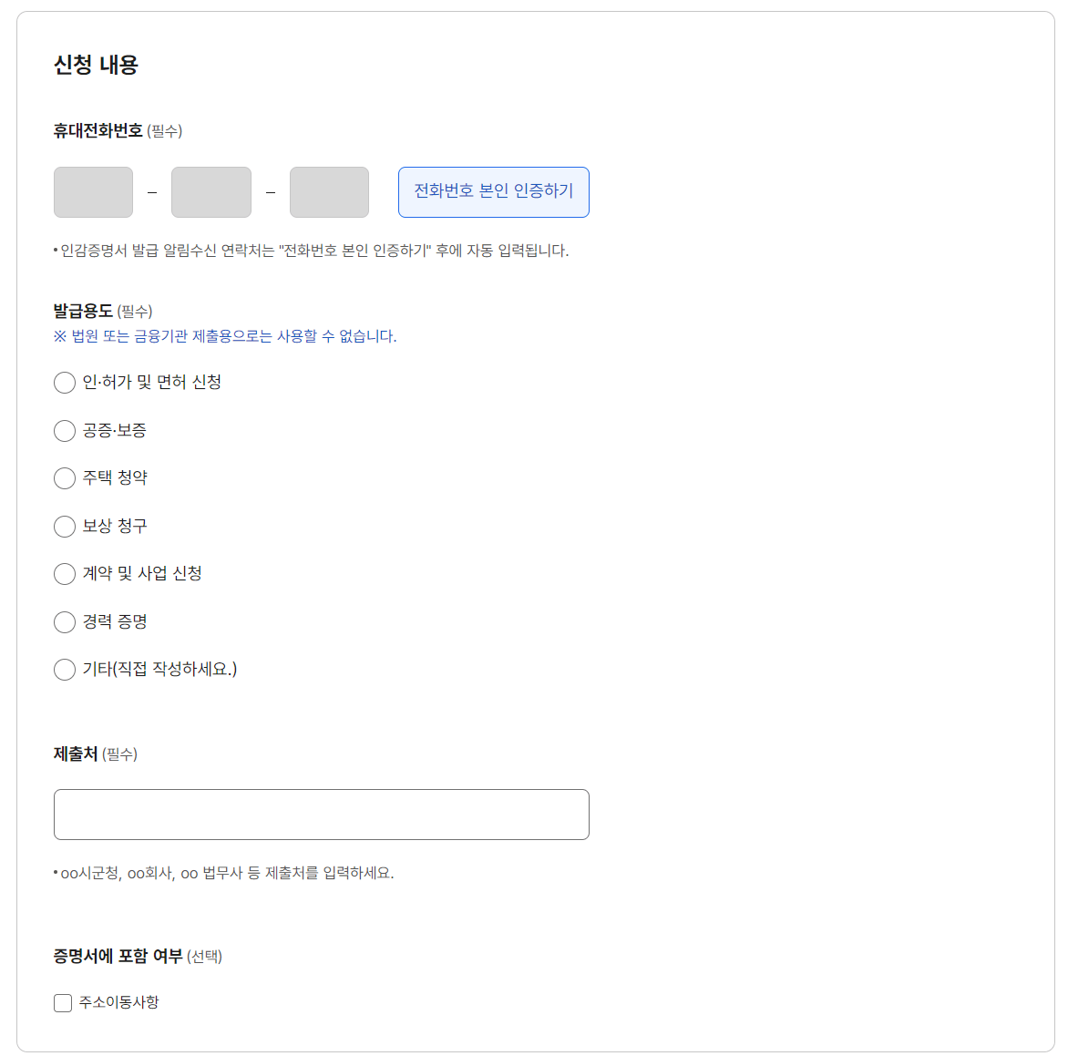 ** 법원(부동산등기, 채권담보설정, 공탁)이나 금융기관(대출신청)에 제출하는 용도는 이전처럼 행정복지센터를 방문하여 발급받아야 합니다.