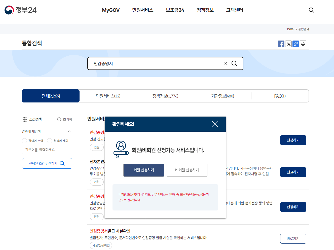 3) <인감증명서 - 신청하기> 버튼을 눌러 회원 또는 비회원으로 로그인을 합니다.