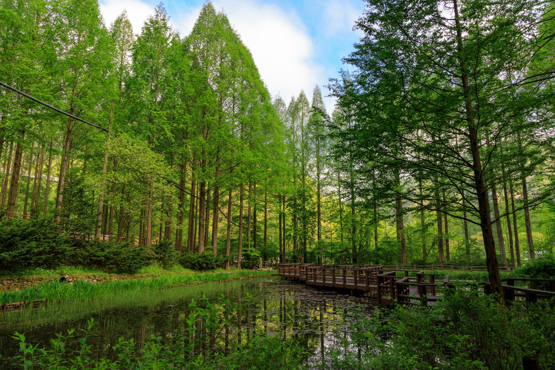 장태산 자연휴양림은 국내 자연휴양림 중 유일하게 메타세콰이아가 울창하게 숲을 이루어 이국적인 경관을 자아냅니다.