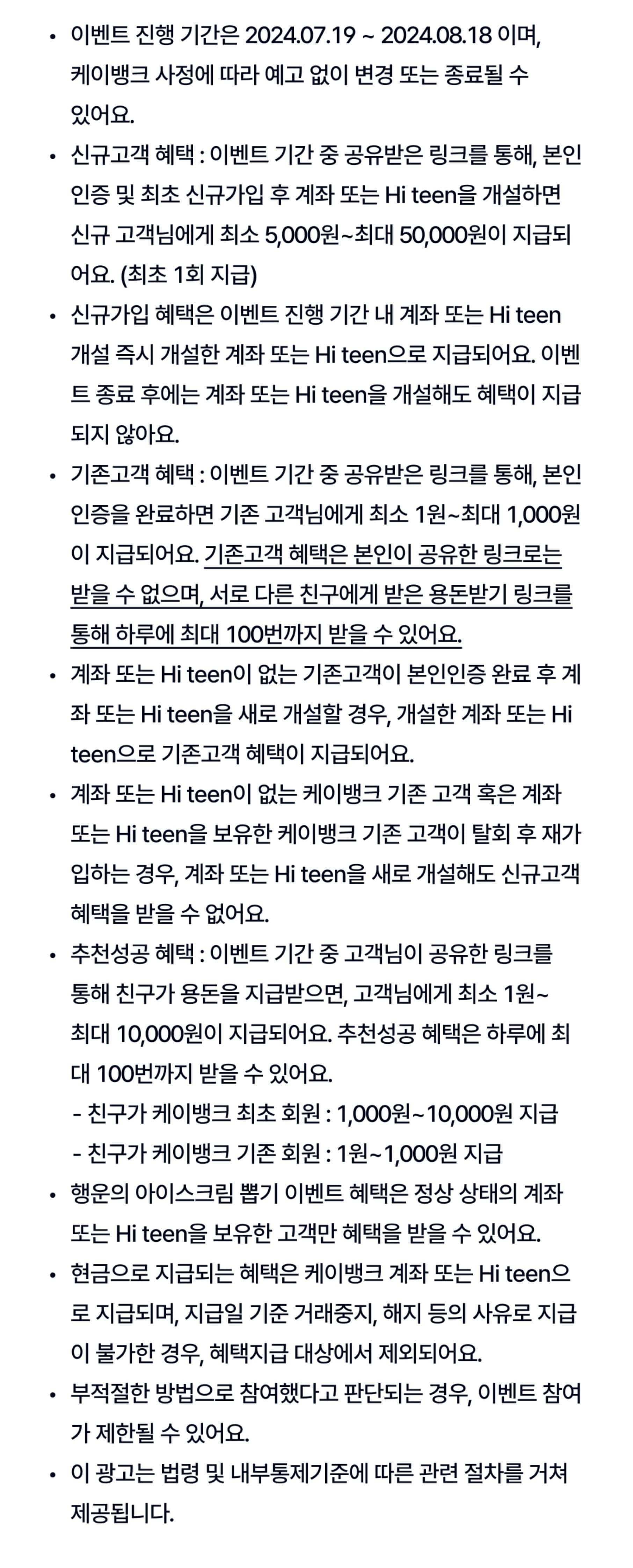 2) 친구가 케이벵크 기존 회원이면 : 최대 1,000원 ~ 최소 1원 지급 → 최대 10만원까지 받을 수 있습니다.