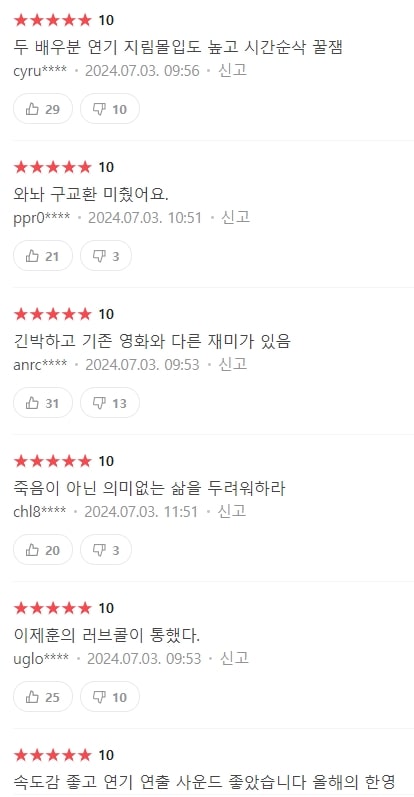 네티즌 평점 10점만점에 8.16점으로 높은 완성도를 바탕으로 영화평이 남녀 모두에게 매우 좋은 평가를 받고 있습니다.