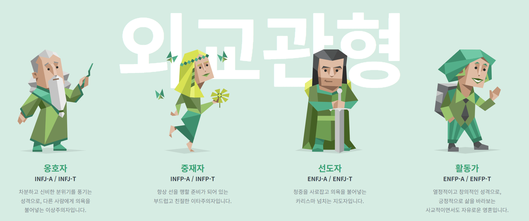 - 감정형 F : 공감능력이 좋아 원칙보다는 상황적인 특성을 고려하여 사람을 대합니다.